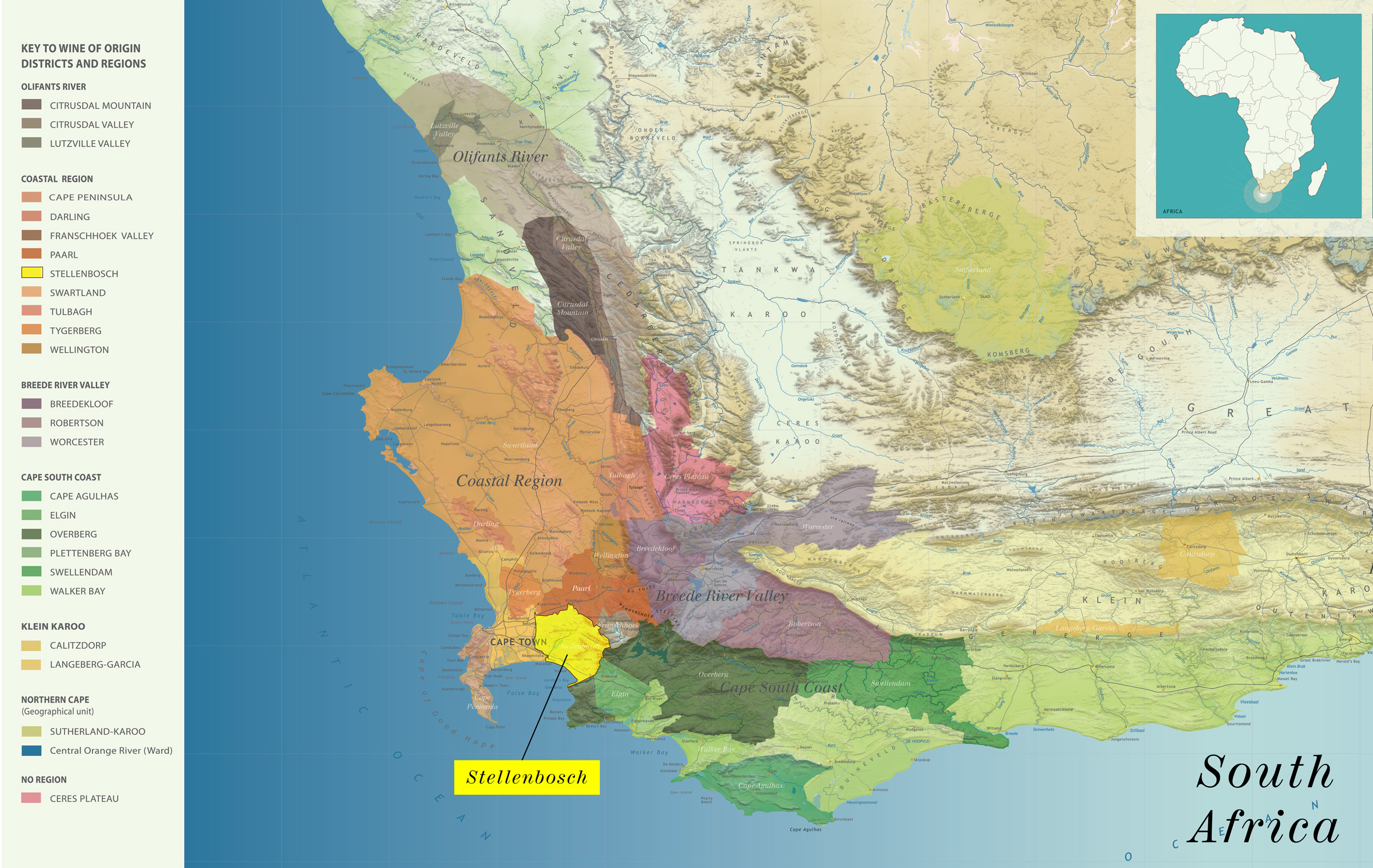 Many of the photos we see of South African vineyards–positioned in front of striking granite mountains,–are from the Stellenbosch area. It contains the most developed winelands; it is home to an important wine University (University of Stellenbosch); and it is the center of wine tourism. In short, Stellenbosch is to South African wine much like Napa is to Californian wine.