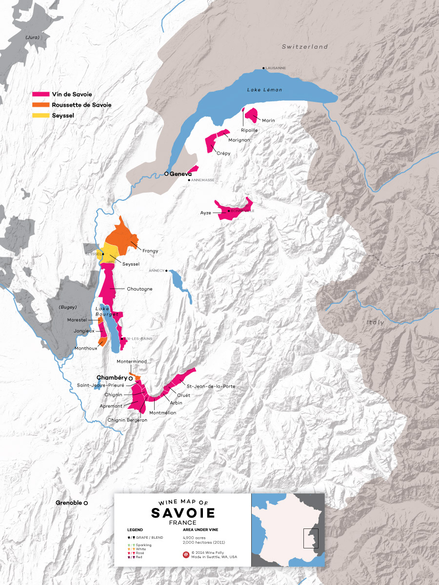 - Vin de Savoie AOP: 16 crus producing white, rosé, red and sparkling wines.