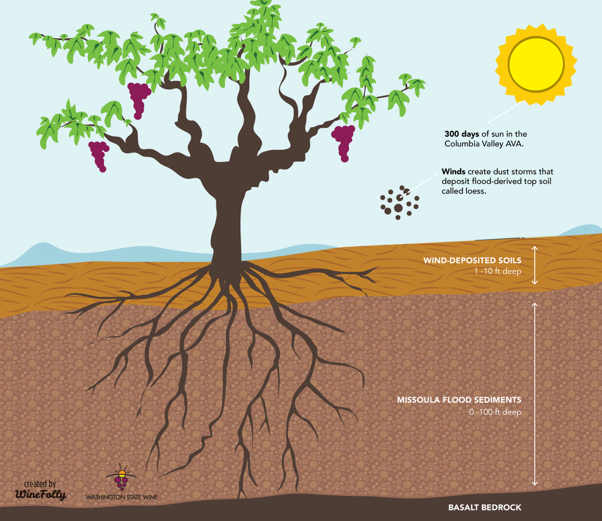 Just so you know, there is a strange correlation to the highest rated wines coming from mature vineyards with deep deposits of this special flood soil. Need an example? Check out Horse Heaven Hills (watch the overview).