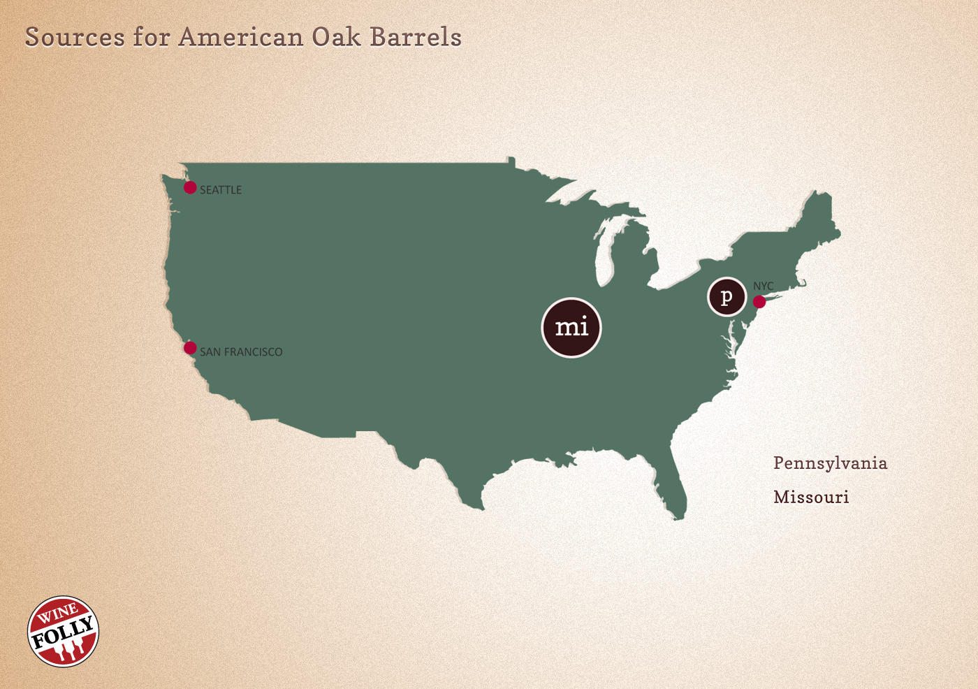 There are many types of oak trees in America, but the species used for oaking wine is American White Oak (Quercus alba). Quercus alba grows throughout the Eastern US and is commonly found in Missouri. American cooperages predominantly produce barrels for the Bourbon industry. Because of the demand, whiskey makers like Scotlandâs âThe Macallanâ own forests in the United States. American oak tends to be in less demand for wine barrel use.