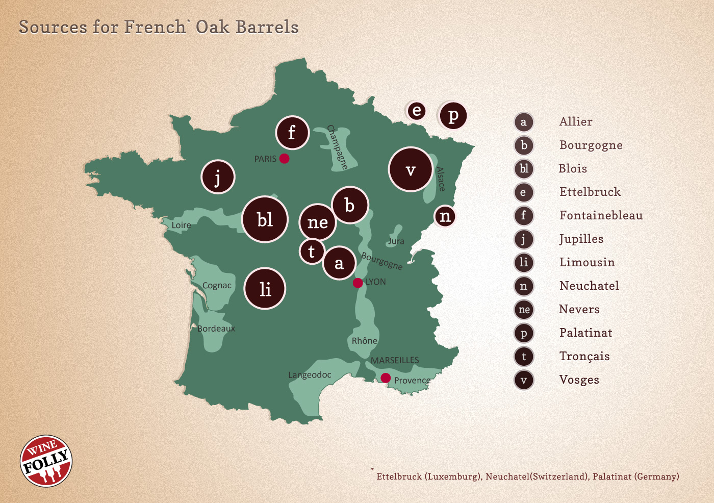 The oak forests in France are the source of several species of European Oak trees, including white oak used for oaking wine. French Oak (Quercus robur) is common throughout Europe and Sessile Oak (Quercus petraea) is a finer grain species that is more sparse. The forests used for barrel oak are selected for their fine-grained consistent wood. Most notably, well-made barrels from Alliers, Vosges, and Tronçais command the highest prices (upwards of $4,000 per barrel). Limousin oak is more loose-grained, making it more suited for Cognac, Armagnac, Sherry, and whiskey aging.